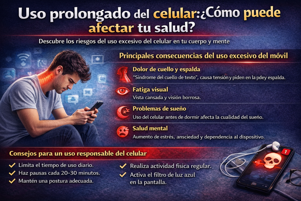 El celular es una herramienta útil que facilita muchas actividades de la vida diaria. Sin embargo, su uso prolongado y sin control puede generar efectos negativos en la salud física y mental.